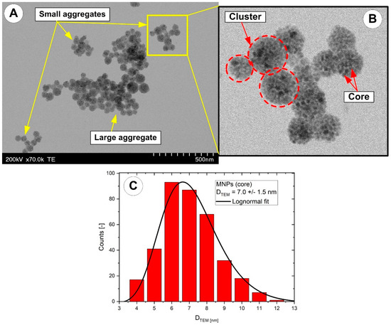 Figure 3C displays the diameter distribution of the core magnetic nanoparticles. With an average core size of 7 ± 1.5 nm and an average cluster size of 62 ± 17 nm (presented in our previous work [22]), TEM observations support the multicore flower-like shape of synthesized particles.