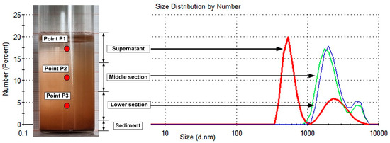 Figure 5 shows that the peak position moved to be smaller for the supernatant region, demonstrating that the sedimentation processes are progressing. Small and large aggregates and agglomerates are present in the supernatant, but the number of the small structures is much larger than the large ones. The particle size distribution in the middle section and the lower area is very similar but indicates the presence of the gravitational sedimentation processes with the bimodal size distribution. More important is that, at the end of 60 min, a consistent layer of PEG-MNCs was deposited on the bottom of the tube.