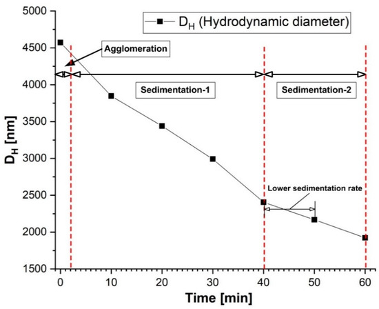 The PEG-MNC suspensions’ sedimentation kinetic curve is shown in Figure 6. In Figure 6, the sedimentation profile is divided into three areas: agglomeration, sedimentation-1, and sedimentation-2, according to the findings presented in [31]. When the aggregates or agglomerates reach a threshold size, they rapidly deposit (“sedimentation-1” segment in Figure 6). After a while, the sedimentation rate can decline, consistent with the sedimentation of various structures that fail to reach the required critical size [31].