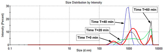 As shown in Figure 7, the initial suspension (time T = 0 min, performed exactly after sonication) exhibited a broad polydisperse and multimodal size distribution primarily in the 530 nm–3 μm range, with two minor fractions of particles, the first of which had a peak centre near 230 nm (range of 190 to 530 nm) and the second of which had a peak centre near 5.5 μm (range of 3.5 to 6.4 μm). As can be seen in Figure 7, the initial PEG-MNCs’ profile changed throughout the investigation from a multimodal distribution (times T = 0 min and T = 60 min) to a bimodal distribution (T = 20 min) and a monomodal distribution (T = 40 min), displaying both a microscale agglomerate and a nanoscale fraction.