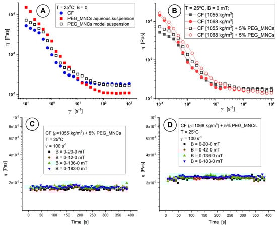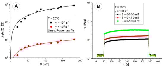 Rheological studies of the PEG_MNC suspension at low field strength (42 mT, Figure 8A) revealed a considerable increase in viscosity across the whole examined shear domain. Furthermore, even at a fixed shear rate, when the field intensity increases, the magnetic force prevails over the hydrodynamic force, increasing viscosity as the field-induced aggregates grow stronger and resist shear. These findings emphasize the unfavourable influence of polydispersity and higher aggregate size on rheological behaviour and agglomerate formation.