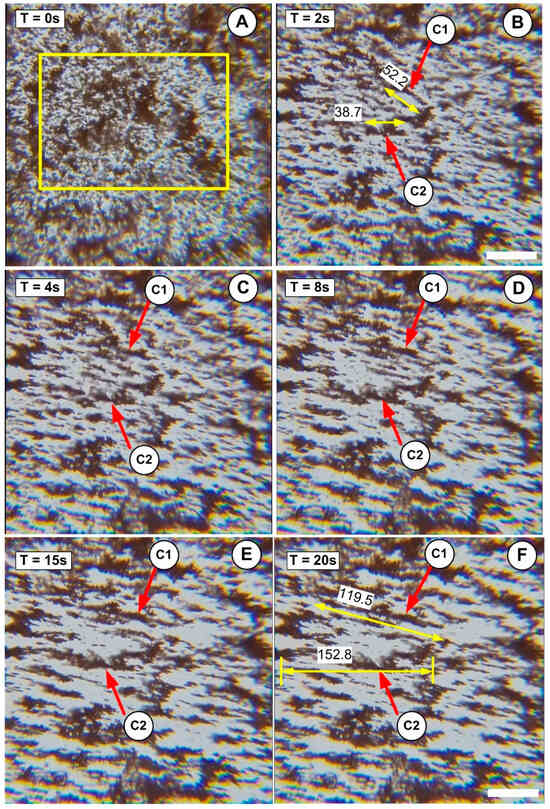 As shown in Figure 11B and more clearly in the Supplemental Video, a short but thick structure emerges a few seconds after the rapid initiation of the magnetic field. These formations (agglomerates) are oriented in the field direction and move in the carrier fluid. During the following several seconds, these primary agglomerates adhere together head to tail to create large (>150 μm) and practically stationary needle-like secondary agglomerates (Figure 11F). The agglomerate’s size grows with time (Figure 11B–F). Individual agglomerates develop relatively quickly (between 2 and 8 s), owing to the adsorption of magnetic clusters or tiny aggregates from the surrounding fluid. Because of their dipolar contacts, the surrounding aggregates consolidate and form a long-size structure (agglomerates) in the following period (between 10 and 20 s, Figure 11D,F).