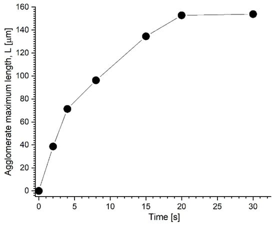 Figure 12 depicts the experimental dependence of the maximum aggregate length L on elapsed time t for a sample containing 5% PEG_MNC mass concentration in a magnetic field strength of 124 mT. As presented in the section Effect of the Magnetic Field Intensity, the aggregate length increased with time, a fact confirmed with Figure 12. As the figure shows, the experimental L(t) curves shift in the slope at t = 8 s. Furthermore, the agglomeration process approaches saturation 20 s after applying the magnetic field. After this period, the aggregates’ form and length remain constant. This observed behaviour is strongly connected to the magneto-viscous features described in previous sections.