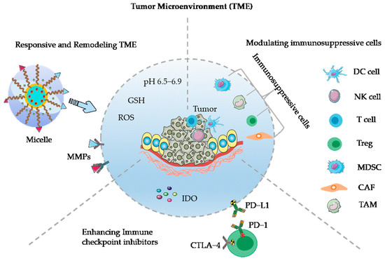 Remodeling TME: Cancer cells employ diverse mechanisms to restructure the TME, thereby evading immune surveillance and fostering tumor proliferation and metastasis. The TME encompasses an intricate interplay of cancer cells, the extracellular matrix (ECM), stromal cells, and immune cells. Throughout the course of cancer development and progression, the ECM within the TME undergoes extensive remodeling. This remodeling can exert inhibitory effects on immune responses, frequently resulting in inadequate or less-than-optimal tumor responses to immunotherapy in most instances. Strategies in immunotherapy encompass a range of approaches such as adoptive cell therapy (ACT), vaccines, and immunomodulatory antibodies, all aimed at reshaping the immunosuppressive milieu of the tumor microenvironment towards an environment conducive to immune support [67]. Many researchers have attempted to enhance drug-loaded nanocarrier delivery efficiency by modifying the ECM within the TME [68,69]. Chanyoung Song and colleagues investigated an innovative approach using an injectable immunomodulatory multidomain nanogel (iGel), which effectively addresses this challenge by converting the pro-tumoral TME into anti-tumoral immune-friendly niches. The iGel is formed through electrostatic interactions between negatively charged non-concentric multi-nanodomain vesicles and positively charged nanoliposomes, both loaded with immunomodulatory agents. The gel structure can be temporarily disassembled under shear force during syringe injection and reassembled once shear force is removed at the treatment site. The iGel serves as an immunotherapeutic platform capable of reshaping immunosuppressive TMEs and synergizing with checkpoint therapies in cancer immunotherapy, all while reducing systemic toxicity [70]. Furthermore, micelle-like PLGA-PEG-anisamide nanocarriers loaded with cisplatin and rapamycin, when co-encapsulated with rapamycin, exhibited a 3.5-fold improvement in rapamycin loading efficiency. Co-delivery of these micelles resulted in reduced numbers of tumor-associated fibroblasts and decreased levels of collagen expression within xenograft tumors. These micelles demonstrated antiangiogenic effects, normalization of tumor blood vessels, and enhanced penetration in A375-luc human melanoma [71]. Additionally, SUNb-PM, an engineered polymeric micelle delivery system, exhibited synergistic effects when used in conjunction with vaccine therapy in an advanced mouse melanoma model. SUNb-PM not only facilitated the transformation of TAFs, collagen, and tumor vasculature but also induced tumor cell apoptosis, reducing tumor immune evasion by inhibiting the Stat3 and AKT signaling pathways [72].