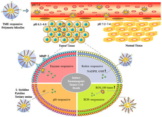 TME is a highly intricate milieu comprising normal and cancerous tissue-resident cells, immune cells, vascular cells, fibroblasts and components of the extracellular matrix [37,38]. Unfortunately, the immunosuppressive TME limits the efficacy of immunotherapy [39]. In contrast to healthy tissue, the TME exhibits an acidic pH, upregulation of certain enzymes, increased redox potential, ROS, and hypoxia [40,41]. Polymeric micelles, as a nanocarrier that responds to the tumor microenvironment, could enhance tumor immunotherapy, and are shown in Figure 2.