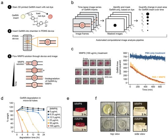 The work described here involves an experimental setup coupling a millifluidic device with a computational image-analysis pipeline that quantitatively measured the biodegradation of GelMA hydrogel discs continuously over the course of 20 h (Figure 2a). A series of time-lapse images of the GelMA biodegradation was acquired, and an image-analysis pipeline was applied (Figure 2b), which identified the image pixels that corresponded only to the GelMA material and recorded the change in the pixel area of the GelMA over time. As expected, the GelMA insert visibly degraded over time with MMP9 exposure, with complete biodegradation taking over 10 h when treated with 100 μg/mL MMP9, as seen in Figure 2c.