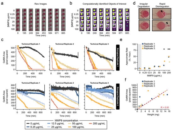 It should be noted that very high MMP9 concentrations (>100 μg/mL) produced results with considerable variation between technical replicates (Figure 3c). In fact, at very high concentrations (200 μg/mL), the degradation was rapid and irregular. In some instances, a drastic decrease in the detectable material was observed for the GelMA, suggesting a sudden disintegration of the material rather than a gradual reduction in size that was observed in the GelMA hydrogel. Indeed, visible biodegradation debris could be seen flowing out of the device (Figure 3d). Despite these sources of variation, the overall average rates of GelMA degradation across the entire experiment generally agreed between biological replicates (Figure 3e). Most importantly, there was a very high positive agreement between the computationally measured sizes of the GelMA hydrogel samples as compared to their mass loss (R = 0.91, Figure 3f).