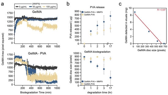 Next, the simultaneous biodegradation and release of an encapsulated molecule were evaluated from the GelMA hydrogel discs. To this end, the release of PVA (as a model therapeutic) was quantified from the eluates from the millifluidic device, as illustrated in Figure 4. It was observed that the degradation of the GelMA-PVA hydrogel was substantially faster than that of the GelMA hydrogels alone (Figure 4a). Nevertheless, there was a detectable sustained release of PVA from the GelMA-PVA hydrogels over the 17 h of the MMP9 treatment (Figure 4b). Interestingly, PVA was detected even in the absence of MMP9, which suggests that some PVA can still be released from the hydrogel via passive diffusion. Indeed, a burst of PVA was detected at 1 hr of treatment in both enzyme and without-enzyme conditions. However, there was a greater increase in PVA detected over time in the eluates in the presence of MMP9 when compared with GelMA-PVA (Figure 4b). In addition to monitoring PVA release from the system, degraded GelMA was also quantified since it would also be present in the eluates. A high correlation (Pearson R = 0.97) was observed between the measured GelMA material in the eluates compared to the apparent hydrogel disc size quantified by the visual method (Figure 4c).