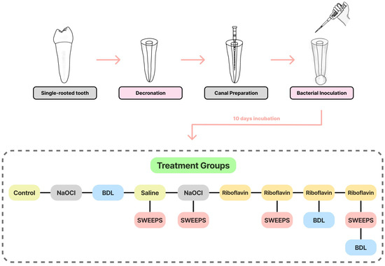 Group 5. SWEEPS + NaOCL: 10 μL of 5.25% NaOCL was injected into the root canals, followed by dark incubation for 5 min. Then, the SWEEPS technique was performed like in Group 4.
