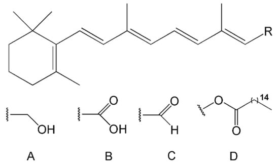 Selected retinoids structure where R can be: A, retinol; B, retinoic acid; C, retinaldehyde; D, vitamin A palmitate.