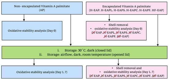 Experimental design for the oxidative stability of non-encapsulated AP and microcapsules with AP under different storage conditions.