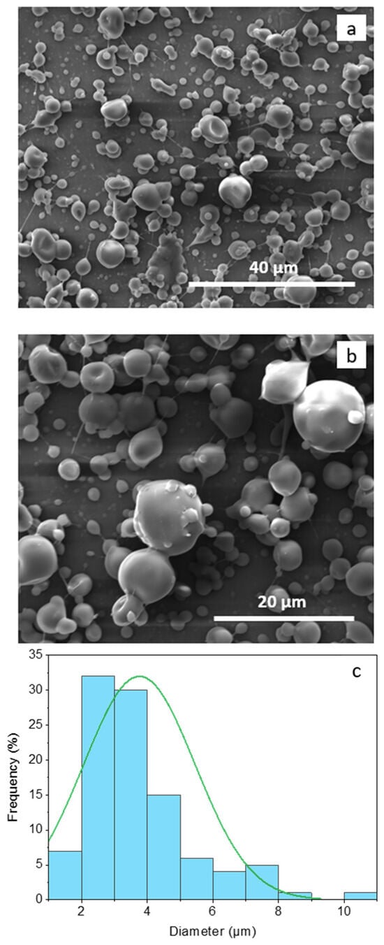 SEM images of H-EAP core–shell microcapsules at different magnifications (a,b) and corresponding histogram displaying their diameter distribution (c).