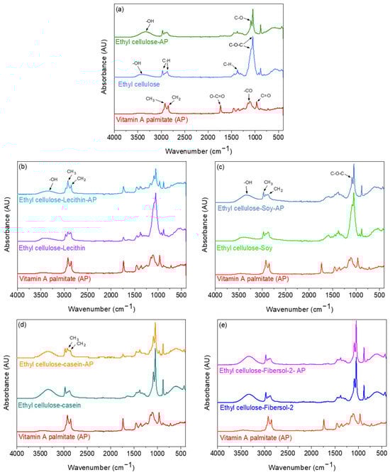 FTIR spectra of vitamin A palmitate (AP) with the core compounds of the microcapsules (after suspension in ethanol and evaporation of the solvent). (a) AP, ethyl cellulose, and ethyl cellulose–AP; (b) AP, ethyl cellulose–lecithin and ethyl cellulose–lecithin–AP; (c) AP, ethyl cellulose–soy protein hydrolysate, ethyl cellulose–soy protein hydrolysate–AP; (d) AP, ethyl cellulose–casein protein hydrolysate, ethyl cellulose–casein protein hydrolysate–AP; (e) AP, ethyl cellulose–resistant maltodextrin (Fibersol-2), ethyl cellulose–Fibersol-2–AP.