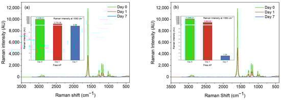 Raman spectroscopy was also used to assess the oxidative stability of AP by exposing the non-encapsulated AP under airflow and 30 °C temperature. Figure 6a,b shows a substantial decrease in the intensity of the main peak assigned to C=C stretching vibration at 1593 cm−1 of non-encapsulated AP due to oxidation by airflow and temperature. The intensity of the peak decreased by 58% and 68% from day 0 to day 1 when non-encapsulated AP was oxidized by air and temperature, respectively. After seven days, the intensity of the peak at 1593 cm−1 decreased by nearly 100%. Overall, the Raman data confirm that the airflow had a higher effect on the oxidation of AP than the temperature (note that the non-encapsulated AP was stored at 30 °C in tubes with a closed lid).