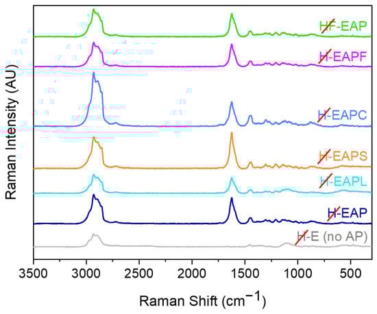 The Raman spectra of AP consist of a broad peak around 2900 cm−1, which corresponds to the methylene group of AP (Figure 5a). However, at 1280 and 1270 cm−1, two weak peaks were present that fit in the range of an epoxy group, and this could indicate the 5,6-Epoxy-AP [,,]. These peaks also appeared in solid AP; thus, they are not due to the handling of AP. A main peak for AP appeared at 1593 cm−1, which is assigned to conjugated C=C stretching vibration of retinol [,], one of the retinyl palmitate derivatives, and confirms the FTIR band appeared at 1085 cm−1 related to the C-O stretch of an alcohol group. The double peaks seen at 1197, 1160, and 1012 cm−1 are related to C-C bonds [].