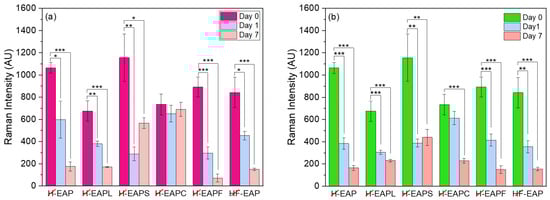 Raman intensity changes at 1593 cm−1 for the microcapsules with AP after storage for 7 days: (a) incubation at 3 + 0 °C (in tubes with a closed lid); (b) under airflow (Raman spectra recorded after removal of the microcapsules shell.) One, two, and three asterisks indicate the significant difference between different days in one sample with p-values of ≤0.05, ≤ 0.01, and ≤0.001, respectively.