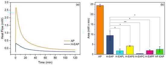 Isothermal DSC results. (a) Isothermal DSC oxidation curves of AP and HEAP at 140 °C and oxygen flow of 50 mL/min. (b) Area under the isothermal oxidation curve for non-encapsulated AP and microcapsules with AP. One or two asterisks indicate a significant difference between different encapsulated samples with p values of ≤0.05 or ≤0.01, respectively (b).