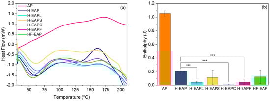 Moreover, from the non-isothermal measurements (Figure 10a) and the evaluation of the enthalpy (Figure 10b), it was also observed that the casein hydrolysate (in the core of the microcapsule) contributed the highest to the oxidative stability of AP (the enthalpy of H-EAPC was hundred times lower than the non-encapsulated AP), and thus significantly delayed the degradation of AP. The addition of other oxidation protection compounds to the core also showed low enthalpy values. It is to be noted that the enthalpy of the H-EAP microcapsule is nearly five times lower than the non-encapsulated AP, further confirming that the dense carbohydrate matrix increased the oxidative stability of AP. Overall, the DSC data are in agreement with the Raman and FTIR results, supporting that both the carbohydrate core–shell matrix and the inclusion of the various compounds at the core or at the shell of the microcapsule improved the oxidative stability of AP.
