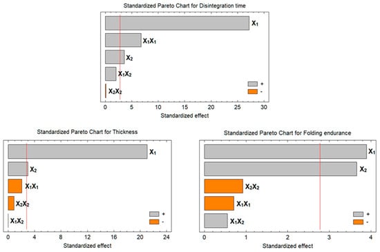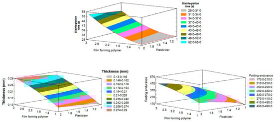 The content of plasticizer (X2) had an impact on the folding endurance of fast-dissolving films (FDF), and there was a direct correlation as plasticizer concentration increased. This behavior could be attributed to the effect of plasticizer, which is added to increase film’s elasticity, as it works by adding more viscosity and elasticity to the film [].