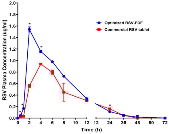 Rosuvastatin calcium plasma time concentration curves after administration of optimized RSV-FDFs and commercial RSV tablets. Data represent the mean value ± standard deviation (SD). * Significant at p < 0.05.