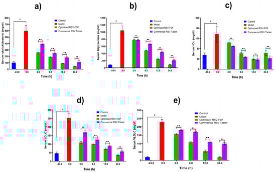 Lipid profiles of induced hyperlipidemic rats after single-dose administration of optimized RSV-FDFs and commercial RSV tablets. Data are presented as mean ± SD (n = 3). Note: # denotes a significant difference between normal and model at p < 0.05, ** denotes a significant difference between the optimized RSV-FDF and the commercial RSV tablets at p < 0.01, and ns denotes a non-significant difference. (a) the total serum cholesterol level in mg/dl, (b) the total serum triglyceride level mg/dl, (c) the serum HDL level mg/dl, (d) the serum LDL level mg/dl, and (e) the serum VLDL level mg/dl.