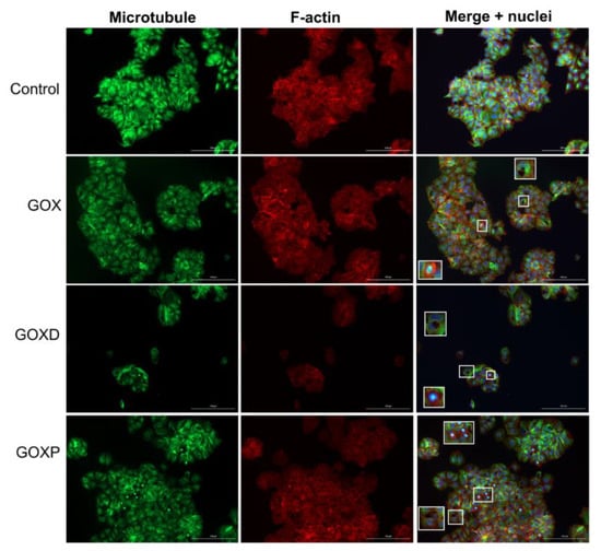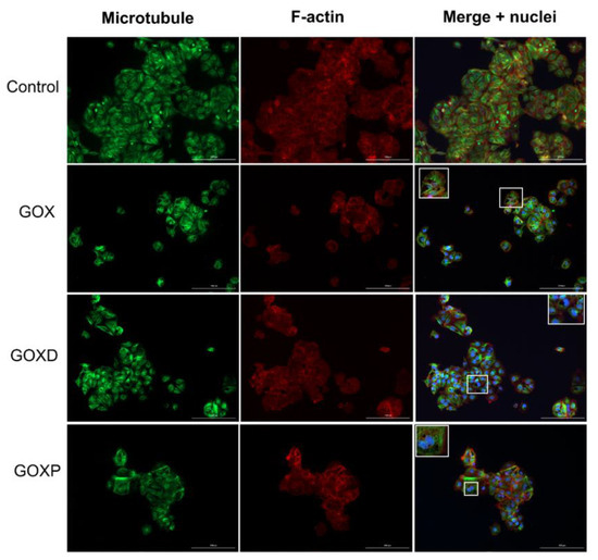 Immunofluorescence experiment of MCF-7 cells cultured in fetal bovine serum-free medium treated with GOX, GOXD and GOXP at the concentration of 24 µg/cm2 for 24 h. The scale bar is 200 µm. The microtubules are evidenced by a mix of monoclonal antibodies against α and β tubulin and anti-mouse FITC-antibody (green). The microfilaments stained with Alexa 633-phalloidin (red). The nuclei was stained with DAPI (blue). Inserts are zooms on white rectangles showing the presence of clusters. Images acquired with the Lionheart fluorescence microscope.