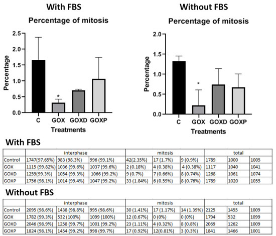 Quantification of mitosis in MCF-7 cells exposed to the GOX materials with FBS and without FBS. Statistical analysis was performed in GraphPad Prism and corresponds to ANOVA analysis. * p < 0.05.