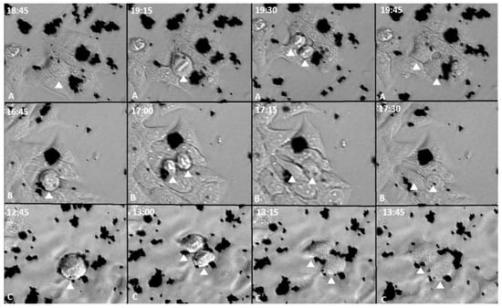 MCF-7 cells in 24 h of exposure to GOX, GOXD and GOXP at a concentration of 24 µg/cm2 in medium with 10% FBS (A: GOX; B: GOXD; C: GOXP). Arrowhead: mitotic cells. Images acquired with the Lionheart microscope. White numbers are the experimental time in hours.
