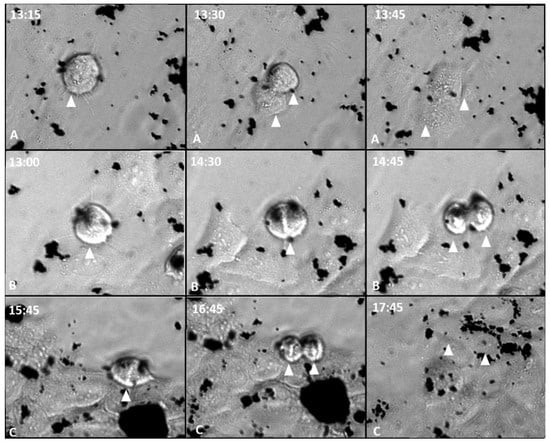 MCF-7 cells in 24 h of exposure to GOX, GOXD and GOXP at a concentration of 24 µg/cm2 in serum-free medium (A: GOX; B: GOXD; C: GOXP). Arrowhead: dividing cells. Images acquired with the Lionheart microscope. White numbers are the experimental time in hours.