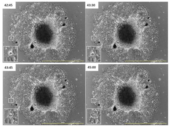 MCF-7 cells in 48 h of exposure to GOXP at a concentration of 24 µg/cm2 in medium with 10% FBS. Highlighted: mitotic cells. Images acquired with the Lionheart microscope. Scale bar: 1000 µm. The numbers are the experimental time in hours.