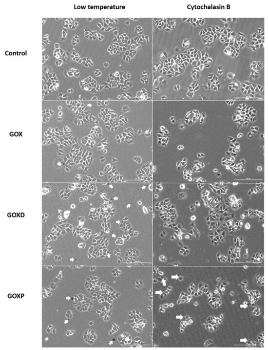 These results agree with the literature. Chatterjee et al. (2014) [38] observed by flow cytometry that in HepG2 cells, in the presence of endocytic pathway inhibitors, GOX was internalized by macropinocytosis and clathrin-mediated endocytosis. Furthermore, Huang et al. (2012) [39] described that human cervical carcinoma-derived cells in the presence of polyethylene glycol-modified GOX performed internalization primarily via clathrin-mediated endocytosis.
