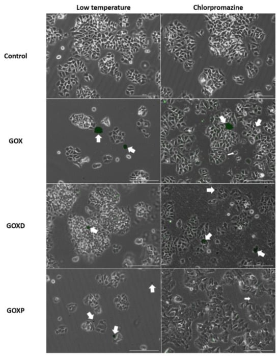 Finally, an interaction of GOX, GOXD and GOXP with the cells was observed (Figure 4 and Figure 5). The mechanism of incorporation of the materials could depend on the cytoskeleton. This result characterizes macropinocytosis, in which the internalization of large amounts of extracellular material occurs by the activation of actin microfilaments to move the digestive vesicle. This explains the structural changes caused by the materials [37] and was confirmed qualitatively through the use of internalization inhibitors in GOX and GOXD (Figure 7). In GOXP, however, there was a qualitative decrease in interaction with cells with 28 µM of chlorpromazine, which inhibits clathrin-mediated endocytosis (Figure 8).