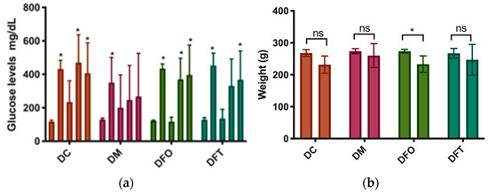 (a) Glucose level mean ± SD in every week, starting with 0 (prior to STZ induction), week 1 (48 h after STZ administration), week 2, week 3, and week 4. *—statistically significant difference in the same group (p < 0.05); (b) Mean weight in the first week of the experiment and the final week. The results are expressed as means ± SD; ns—not significant, *—statistically significant difference in the first week compared with the final week (p < 0.05).