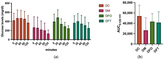 OGTT results. (a) Glucose levels at 0, 30, 60, 90, and 120 min; (b) AUC0–120 min, DC—diabetic control, DM—diabetic rats treated with 300 mg/kg metformin, DFO—diabetic rats treated orally with 400 mg/kg fennel essential oil, DFT—diabetic rats treated topically with 400 mg/kg fennel essential oil. ANOVA analysis indicated that there were no statistically significant differences in the same group for the OGTT test (p ≤ 0.05).