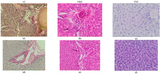 Livers from 4 rats/group were collected and immediately placed in 10% formalin. Three different types of staining were performed using hematoxylin-eosin (H&E), periodic acid Schiff (PAS), and von Gyeson reagents.