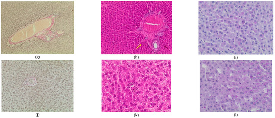 Liver histopathological analysis with van Gieson, H&E, and PAS staining. (a–c) Diabetic control group: severe fibrosis, mononuclear inflammatory infiltrate, low glycogen; (d–f) Diabetic group treated with metformin: fibrosis in the portal area, portal inflammatory infiltrate (black arrow); (g–i) Diabetic group treated with fennel essential oil oral: minor signs of fibrosis, biliary duct hyperplasia (yellow arrow); (j–l) Diabetic group treated with fennel essential oil topical: no or minor signs of fibrosis, inflammation in sinusoids (black arrow).