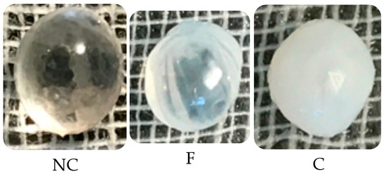Lenses at the end of the ex vivo study; NC—normal control (lenses in culture medium), grade 0, C—control (culture medium + 55 mM glucose), grade 3, F—fennel essential oil treated (culture medium + 55 mM glucose + fennel essential oil), grade 1.