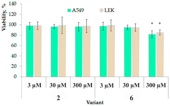 Viability rate for the A459 and LEK cells treated with compounds 2 and 6 after incubation for 48 h. Cell viability in the variant without treatment (solvent control) was taken as 100%. *—p ≤ 0.05 in comparison with solvent control.