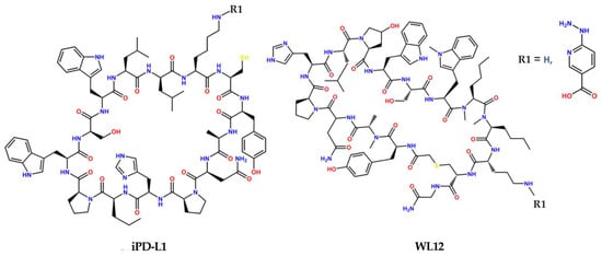 Schematic structures of the programmed death ligand inhibitor peptides named iPD-L1 (designed and evaluated in this research; R1 = H) and WL12 (positive control; R1 = H) and their HYNIC derivatives.