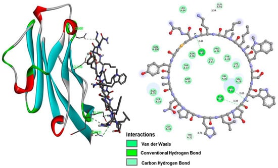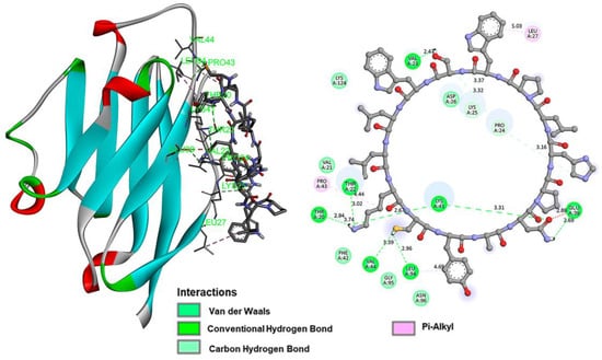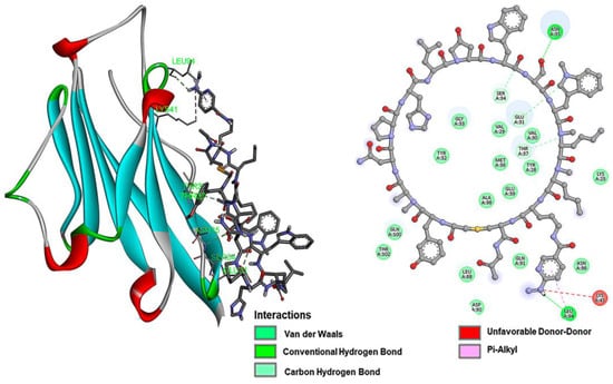 Intermolecular interaction analysis of the PD-L1 protein complex formed with each of the inhibitory peptides is shown in Figure 2 (iPD-L1), Figure 3 (HYNIC-iPD-L1), Figure 4 (WL12), and Figure 5 (HYNIC-WL12). As expected, the addition of HYNIC as a side chain to the peptide macrocycles of PD-L1 and W12 induces changes in the interaction sites with the PD-L1 protein and, consequently, in the molecular binding energy scoring function (kcal/mol), which is directly related to the affinity. In other words, for both PD-L1 and W12, the presence of HYNIC increases their affinity by decreasing the value of the scoring function linked to the binding potential energy (kcal/mol). Specifically, HYNIC-PD-L1 is the molecule that showed the highest affinity (Table 1), which may be related to the more rigid nature of its cyclic structure due to the absence of the -S- bound (present in WL12), allowing a greater number of interactions with the protein through HYNIC located outside the macrocycle (Figure 3).