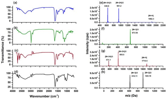 Infrared spectra of (a) WL12, (b) HYNIC-WL12, (c) iPD-L1, and (d) HYNIC-iPD-L1 peptides. Mass spectra of (e) WL12, (f) HYNIC-WL12, (g) iPD-L1, and (h) HYNIC-iPD-L1 peptides.