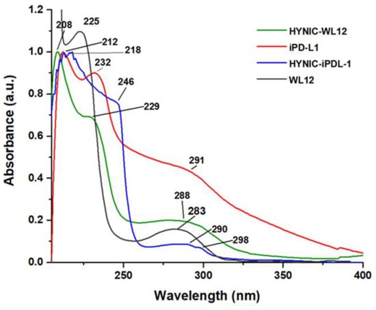In the UV–vis spectrum of iPD-L1 (Figure 7), the n→σ* contribution to the absorption band from the thiol and amine groups was observed in the bands centered at 212 nm and 232 nm, associated with the nonbonding electron pairs from the amine and thiol groups. The π→π* transitions were also observed at 232 nm. In addition, the n→σ* transition of -C=O was observed at 290 nm. In the HYNIC-iPD-L1 spectrum (Figure 7), a redshift from 212 nm to 218 nm and the redshifts observed at 246 nm and 298 nm confirmed the chemical conjugation of iPDL1 to HYNIC. In addition, the absorption band at 246 nm also provides evidence for the modification of the -C-S bond in the conformation of the new HYNIC-iPD-L1 chemical structure. Similarly, the bathochromic shift from 225 nm and 283 nm (WL12 spectrum) to 229 nm and 288 nm (HYNIC-WL12), respectively, was indicative of the HYNIC and WL12 conjugation (Figure 7).