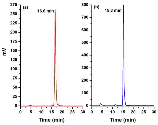 Radio-chromatogram of (a) [99mTc]Tc-iPD-L1 and (b) [99mTc]Tc-WL12. Reversed-phase column (C18, 3.9 × 300 mm, 10µm particle size).