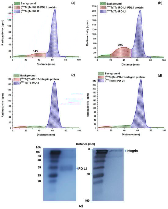 SDS-PAGE (radio-SDS-PAGE). Migration of [99mTc]Tc-iPD-L1 (Rf = 0.6–0.7; 60–70 mm) and [99mTc]Tc-WL12 (Rf = 0.6–0.7; 60–70 mm). (a) Interaction [99mTc]Tc-WL12-PDL1 protein showing 14% of the radioactivity shifted at a distance associated with the PD-L1 protein. (b) Interaction [99mTc]Tc-iPD-L1-PDL1 protein showing 30% of the radioactivity shifted at a distance associated with the PD-L1 protein. (c,d) No shift in radioactivity when [99mTc]Tc-WL12-PDL1 and [99mTc]Tc-iPD-L1-PDL1 interact with the integrin protein (negative control). (e) Migration of PD-L1 (Rf = 0.4; 40 mm) and integrin (Rf = 0.0; 0.0 mm) in the gel plate.