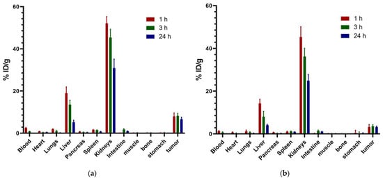 The evaluation of the biodistribution of [99mTc]Tc-WL12 and [99mTc]Tc-iPD-L1 in nude mice with induced lung cancer tumors (HCC827 cells) showed a tumor uptake of 3.22 ± 1.20% and 6.98 ± 0.89% of the injected dose/g, respectively, at 1 h after injection (Figure 11). After 24 h, the activity in tumors was 3.21 ± 0.45 %ID/g ([99mTc]Tc-WL12) and 5.65 ± 0.98 %ID/g ([99mTc]Tc-iPD-L1). Two-way ANOVA statistical analysis (alpha 0.05) showed that there were significant differences (p < 0.0001) in the percentage of tumor uptake over time due to the radiotracer type as follows: mean of [99mTc]Tc-WL12 = 6.617; mean of [99mTc]Tc-iPD-L1 = 3.347; difference between means: 3.270; SE of difference = 0.4414; 95% CI of difference = 2.308 to 4.232. Both radiopharmaceuticals showed hepatobiliary and renal elimination. Although [99mTc]Tc-iPD-L1 demonstrated a significantly higher tumor uptake compared to [99mTc]Tc-WL12, higher activity in blood, liver, and kidney was also observed for the 99mTc-labeled iPD-L1 peptide. This behavior is related to the higher lipophilicity of [99mTc]Tc-iPD-L1 compared to [99mTc]Tc-WL12. Nevertheless, both radiotracers showed potential for the in vivo detection of PD-L1 expression in tumor lesions.