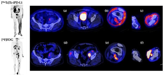 Molecular images of [99mTc]Tc-iPD-L1 (top) and [18F]FDG (bottom) in a patient with plantar malignant melanoma. Axial plane at pelvic level: (a,d). Axial view of left lower leg: (b,e). Axial view of left foot (plantar lesion) and right foot: (c,f).