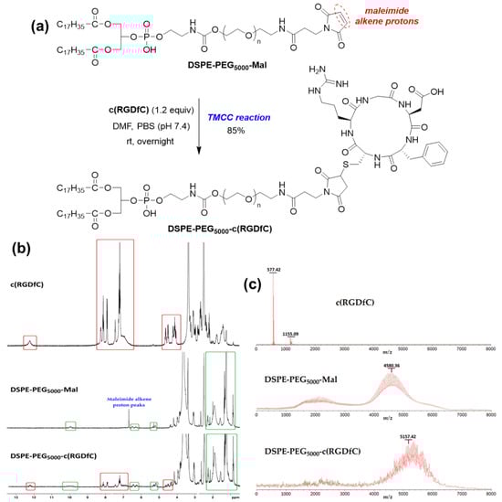 (a) Synthesis of DSPE-PEG5000-c(RGDfC). (b) 1H NMR spectra (300 MHz, DMSO-d6) of c(RGDfC), DSPE-PEG5000-Mal, and DSPE-PEG5000-c(RGDfC). (c) MALDI-TOF mass spectra of c(RGDfC), DSPE-PEG5000-Mal, and DSPE-PEG5000-c(RGDfC).