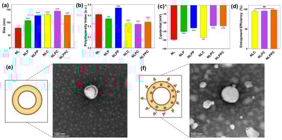 Physicochemical characterizations of empty NL and curcumin-loaded NL with or without PEG coating (NLPC and NLC, respectively), and peptide coating (NLPPC). (a) Size, (b) polydispersity, (c) ζ-potential, and (d) encapsulation efficiencies of NLC, NLPC, and NLPPC. Schematic and TEM images showing (e) NL and (f) NLPPC spherical morphologies. Created with BioRender.com. All data are expressed as mean ± standard deviation. Significance is indicated as ns (not significant), ** (p < 0.01), and *** (p < 0.001).