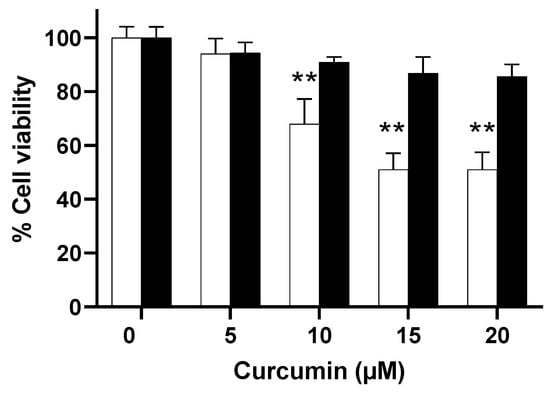 Effect of curcumin encapsulation in NL on cell viability. Primary cultures of rat embryo cortical neurons were incubated with free curcumin (☐) or curcumin loaded in 10 µg/mL NLC at the indicated concentrations (■). Results are shown as mean ± SD (n = 4); ** p < 0.01, as compared to the corresponding control (in the absence of curcumin).