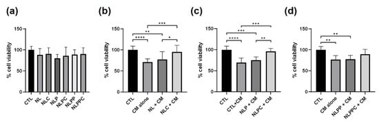 Tests of cytotoxicity (a) and neuroprotection (b–d) of empty and curcumin-encapsulated NL formulations on differentiated SH-SY5Y WT neuronal cell line. (a) Differentiated SH-SY5Y WT neurons were incubated for 24 h at 37 °C with 10 µg/mL empty NL, NLP, NLPP, or 10 µg/mL of curcumin (20 µM) loaded NLC, NLPC, or NLPPC, followed by an analysis of cell viability using MTT. (b–d) In another set of cells, differentiated SH-SY5Y WT neurons were pre-incubated for 24 h at 37 °C with the different NL formulations ((b) NL, NLC; (c) NLP, NLPC; (d) NLPP, NLPPC) and then exposed to conditioned media (CM) from SH-SY5Y APP cells containing Aβ peptide. Since each formulation was tested on a different plate, a set of controls was performed for each NL formulation. Cell viability was determined using MTT. Results are shown as % of cell viability compared to the corresponding controls (mean ± SD; N = 3, n = 3) (*, p < 0.05, **, p < 0.01, ***, p < 0.001, ****, p < 0.0001).